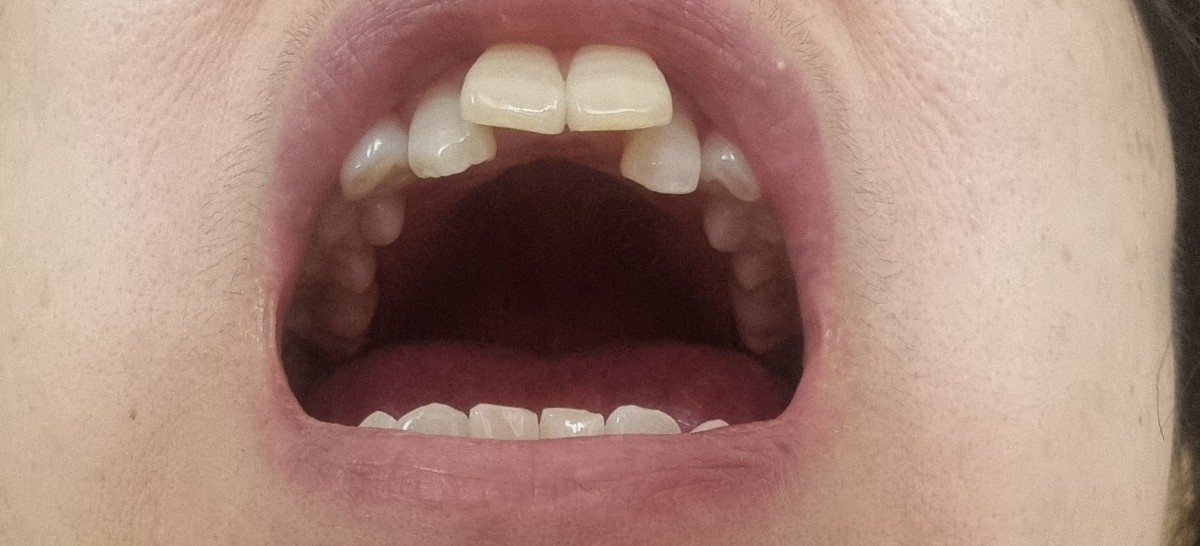 앞 대문니 옆 치아가 뒤로 밀려나 있는 상태입니다